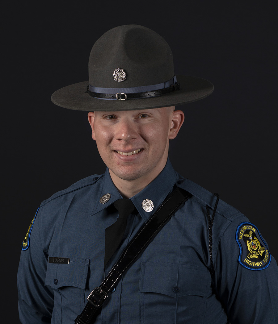 Trooper Devan J. Harms, a native of California, Missouri, has been assigned to Zone 12, which serves the citizens of Johnson County. Trooper Harms graduated from California High School in California, Missouri. Prior to his appointment to the Patrol, Trooper Harms served in the United States Air Force. He holds a Bachelor of Arts in criminal justice from American Military University in Charles Town, West Virginia. Trooper Harms is married to Heather (Frahm) and they have one child.
