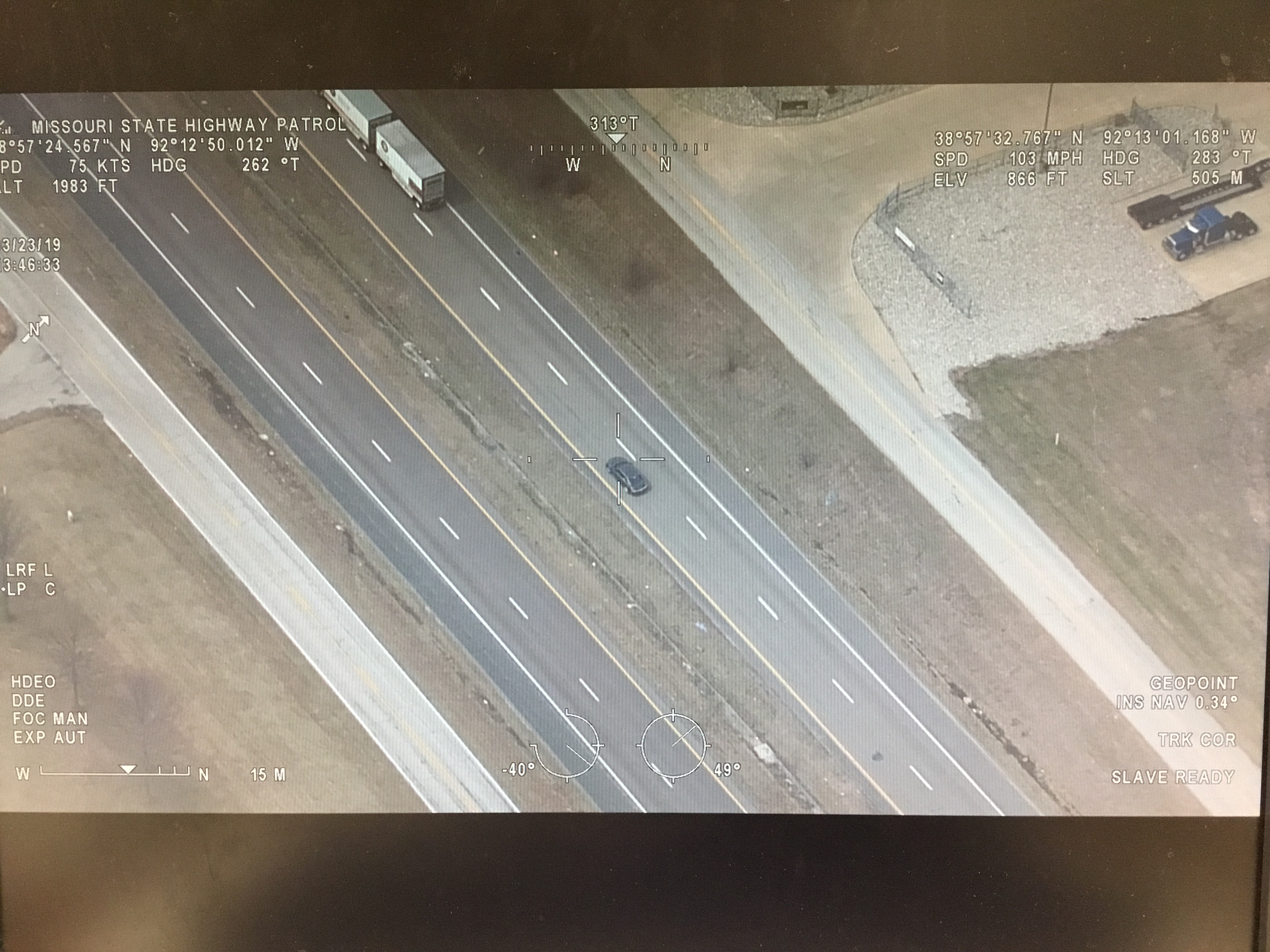 second degree. Initially, the pursuit traveled on Interstate 70 eastbound from the 170-mile marker. The vehicle exited at Missouri Highway 19 and re-entered I-70 westbound. At this time, Montgomery County Sheriff's Department received reports of the passenger brandishing a firearm and the suspect vehicle was reportedly attempting to run other vehicles off the roadway.